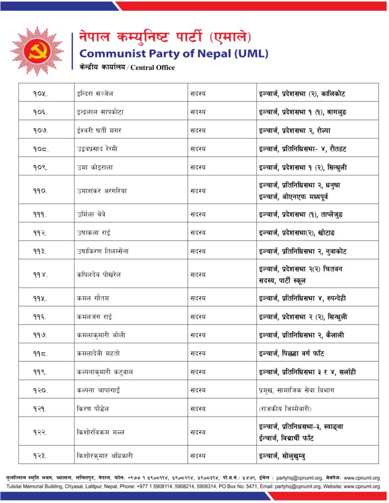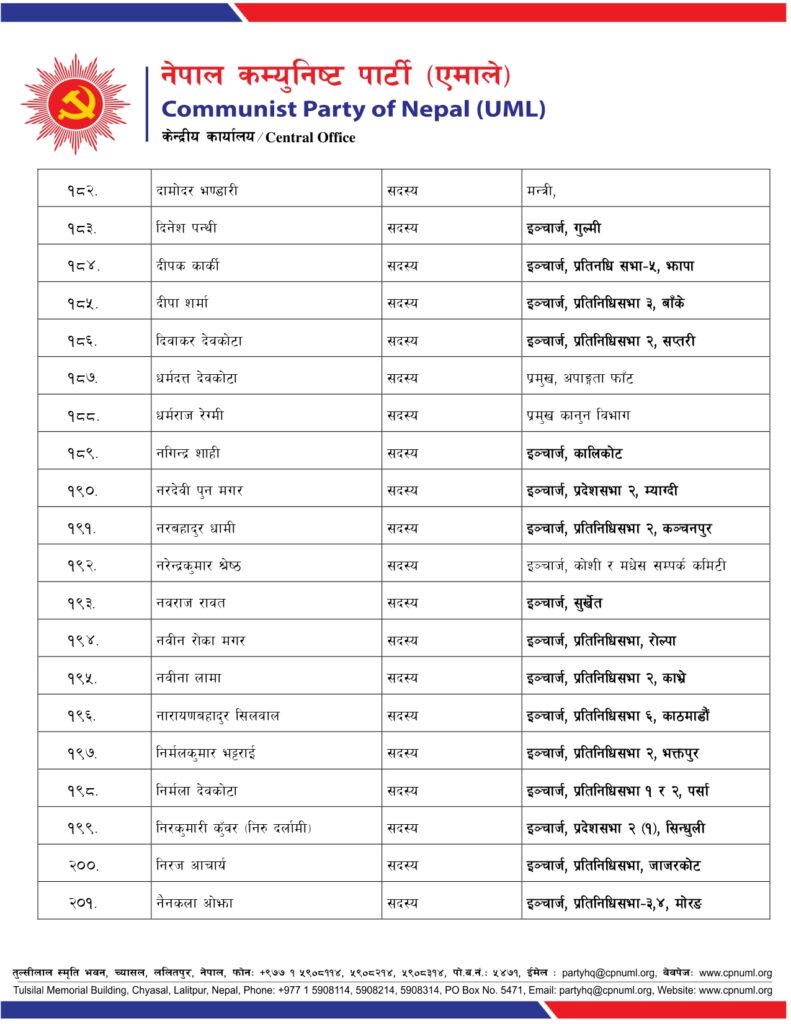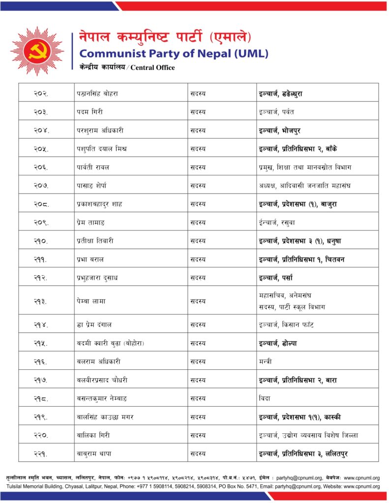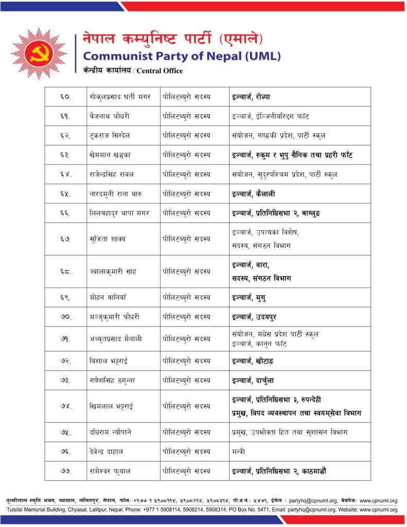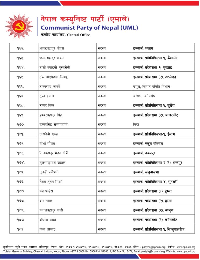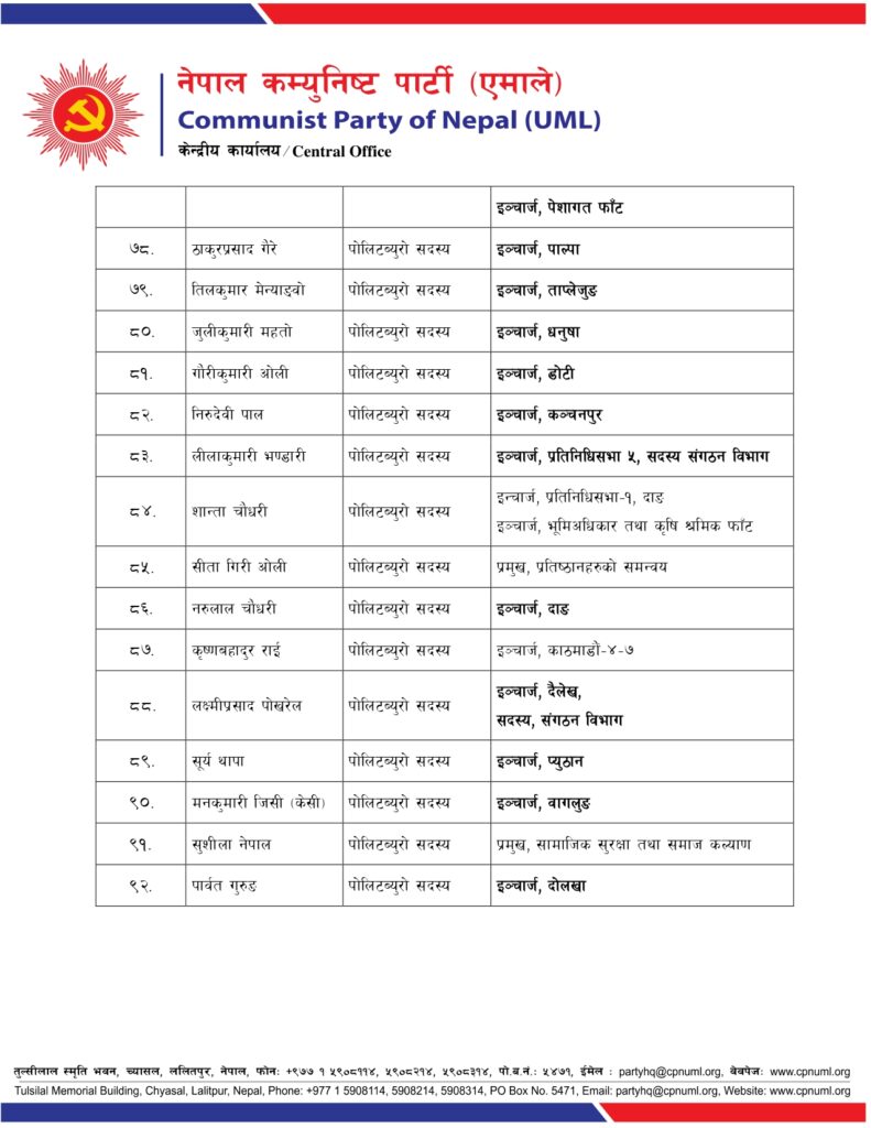 जिल्ला, निर्वाचन क्षेत्र तथा क्षेत्रगत फाँटको ईञ्चार्ज, प्रमुख तथा संयोजकको जिम्मेवारी पनि एमालेले दिएको छ ।