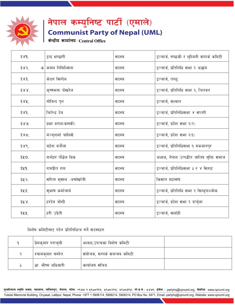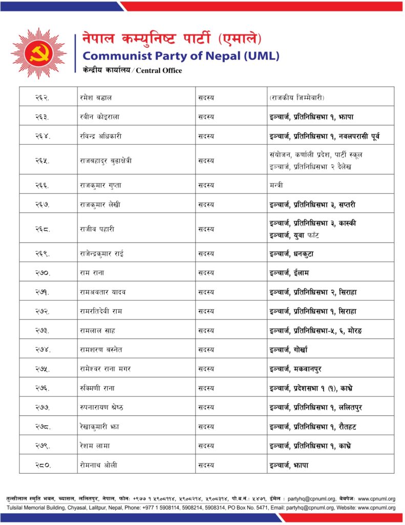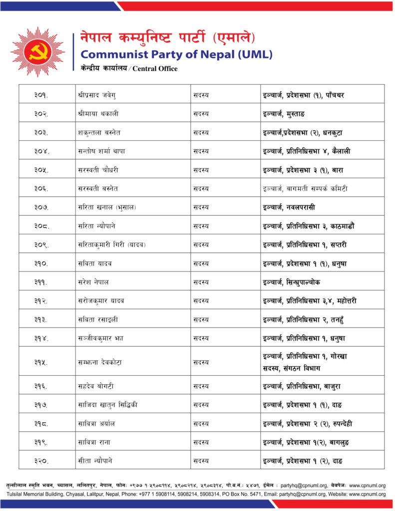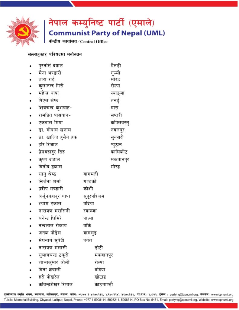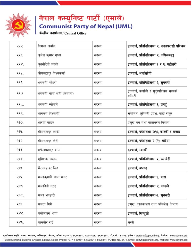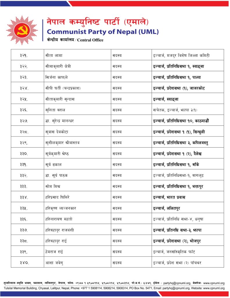 जिल्ला, निर्वाचन क्षेत्र तथा क्षेत्रगत फाँटको ईञ्चार्ज, प्रमुख तथा संयोजकको जिम्मेवारी पनि एमालेले दिएको छ ।