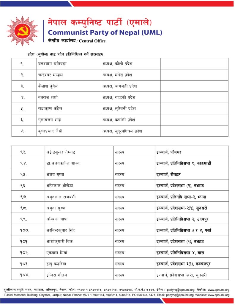 कोशीको ईञ्चार्जमा शेरधन राई, मधेशमा लीलानाथ श्रेष्ठ, बागमतीमा राजन भट्टराई र कर्णालीमा गोरखबहादुर बोगटीलाई प्रदेश ईञ्चार्ज बनाएको विज्ञप्तिमा उल्लेख छ ।