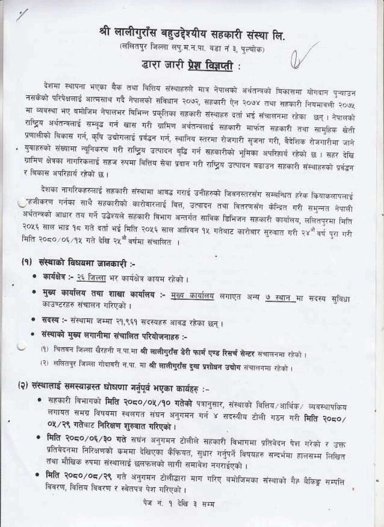 ३ वर्षदेखि नेपालको वित्तीय बजारमा देखिएको तरलता व्यवस्थापन समस्याका बाबजुद पनि संस्थाले सदस्यहरूको बचत रकम फिर्ता गरि दैनिक कार्यलाई निरन्तरता दिँदै संस्था सञ्चालन गरेको अवस्थामा, केही सदस्यहरूको उजुरी परेको भनि सोही आधारमा संस्थालाई समस्याग्रस्त घोषणा गरिएको र केही सदस्यहरूसँग समितिमा बसी पटक पटक छलफल गर्दा समेत संस्थालाई न्यूनतम १ वर्षको समयावधि उपलब्ध गराइदिनु भनि माग गर्दा समितिबाट पनि उक्त विषयमा कुनै पनि प्रतिक्रिया नदिएको विज्ञप्तिमा लालीगुराँसले उल्लेख गरेको छ ।