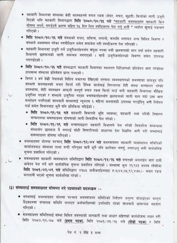 विज्ञप्तिमा भनिएको छ, ‘सहकारी विभागले उजुरी उपर परेको भनिएका सदस्यहरूको सम्बन्धमा छलफल नगराई भूमि, व्यवस्था, सहकारी तथा गरिवी निवारण मन्त्रालयमा समस्याग्रस्त घोषणाको लागि सिफारिस गरिएकोमा मन्त्रालयबाट समेत उक्त विषयमा छलफल नगराई सोही सिफारिसको आधारमा विज्ञप्ति जारी गरि संस्थालाई समस्याग्रस्त घोषणा गरिएको छ ।’
