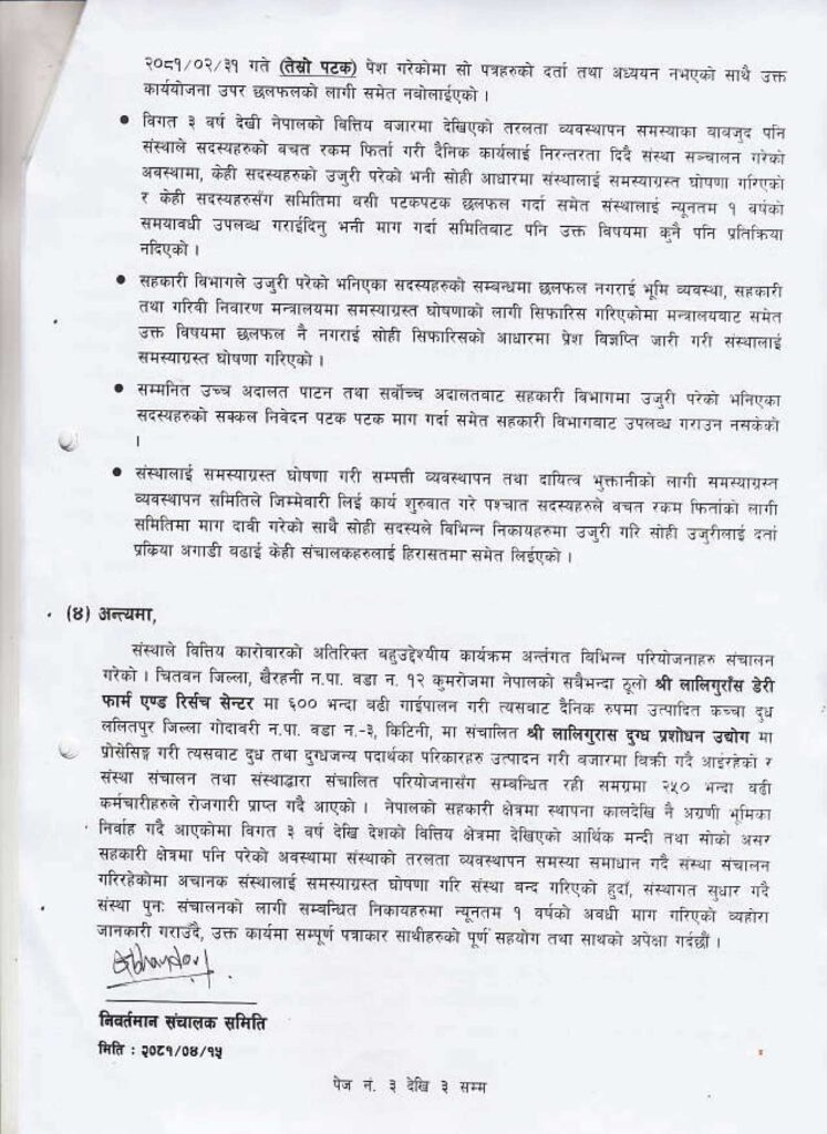 ‘नेपालको सहकारी क्षेत्रमा स्थापनाकालदेखि नै अग्रणी भूमिका निर्वाह गर्दै आएकोमा विगत ३ वर्षदेखि देशको वित्तीय क्षेत्रमा देखिएको आर्थिकमन्दी तथा सोको असर सहकारी क्षेत्रमा पनि परेको अवस्थामा संस्थाको तरलता व्यवस्थापन समस्या समाधान गर्दै संस्था सञ्चालन गरिरहेकोमा अचानक संस्थालाई समस्याग्रस्त घोषणा गरि संस्था बन्द गरिएको हुँदा संस्थागत सुधार गर्दै संस्था पुनः सञ्चालनको लागि सम्बनिधत निकायहरूमा न्यूनतम १ वर्षको अवधि माग गरिएको व्यहोरा जानकारी गराउँदै उक्त कार्यमा सम्पूर्ण साथीहरूको पूर्ण सहयोग तथा साथको अपेक्षा गर्दछौँ’, विज्ञप्तिमा भनिएको छ ।
