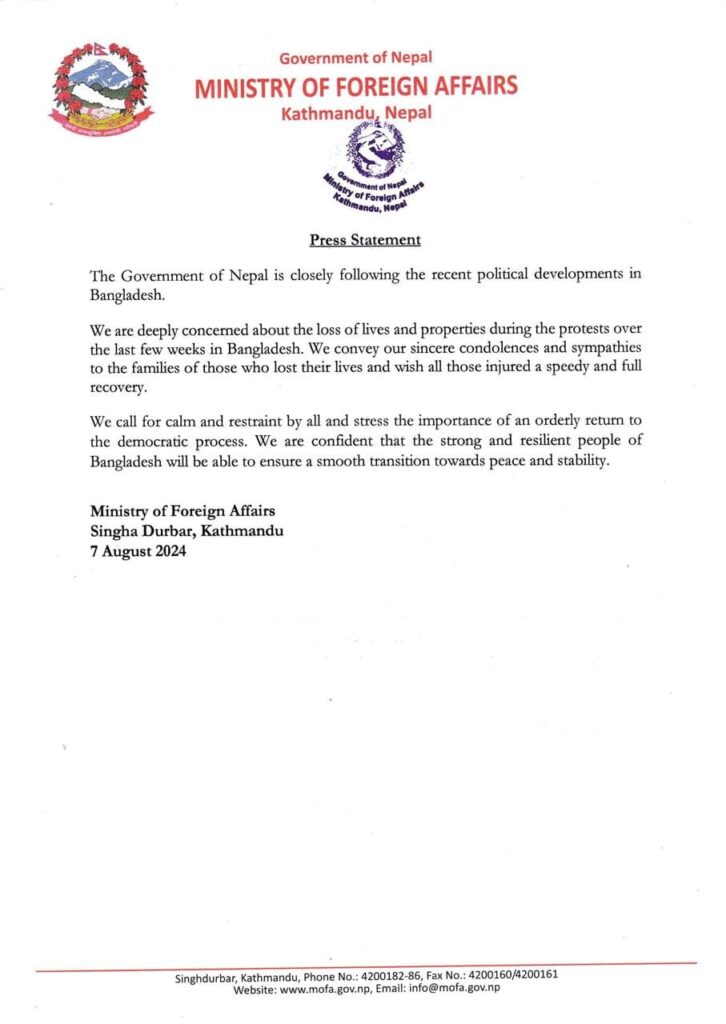 ‘बंगलादेशमा विगत केही सातादेखि भएको विरोध प्रदर्शनका क्रममा भएको जनधनको क्षतिप्रति हामी गहिरो चिन्तित छौं’, विज्ञप्तिमा भनिएको छ, ‘ज्यान गुमाउनेहरूका परिवारजनमा गहिरो समवेदना व्यक्त गर्दै घाइते सबैको शीघ्र स्वास्थ्यलाभको कामना गर्दछौं ।’