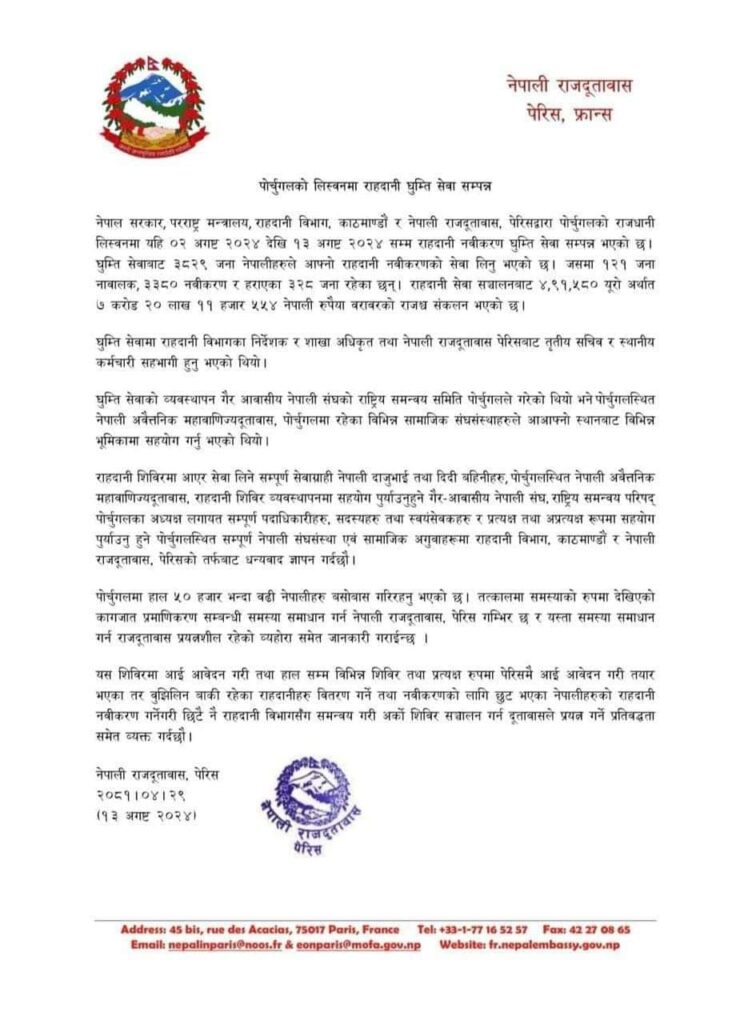 २ अगस्टदेखि १३ अगस्टसम्म घुम्ती सेवा सञ्चालन गरिएको पेरिस राजदूतावासबाट जारी विज्ञप्तिमा उल्लेख छ । परराष्ट्रमन्त्री डा.आरजु राणाको निर्देशनमा पोर्चुगलमा रहेका नेपालीहरूका लागि घुम्ती शिविर सञ्चालन गरिएको छ ।