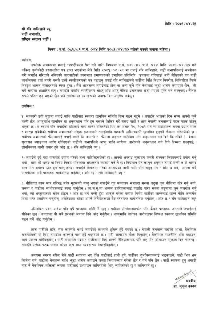 बिहीबार रास्वपाका सभापति लामिछानेलाई सम्बोधन गरेर स्पष्टीकरणको जवाफ दिँदै ढकालले भने, ‘आज पार्टीको छवि, मेरो कारणले नभई तपाईको कारणले धुमिल हुँदै गको छ ।’