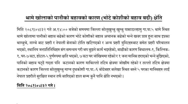 घटनास्थलमा नेपाली सेना र नेपाल प्रहरीको टोली पुगिसकेको छ । दुधकोशी नदीको तल्लो तटीय क्षेत्र भने खतरामुक्त रहेको छ ।