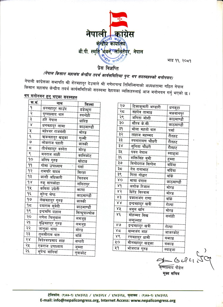 काठमाडौं । नेपाली कांग्रेसका सभापति शेरबहादुर देउवाले नेपाल किसान महासंघ केन्द्रीय तदर्थ कार्यसमितिमा पुनः थप सदस्यहरूको मनोनयन गरेका छन् ।