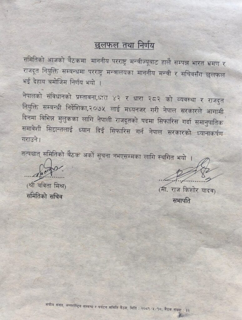 राजदूत सिफारिस गर्दा समानुपातिक समावेशी सिद्धान्तलाई ध्यान दिन सरकारलाई निर्देशन