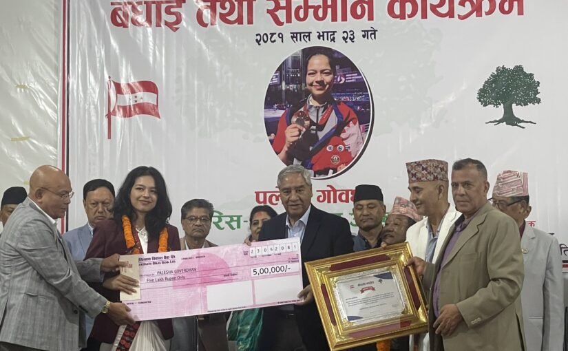 कास्यपदक विजेता पलेशालाई कांग्रेस सभापति देउवाले नगद ५ लाख रुपियाँसहित सम्मान गरेका छन् ।