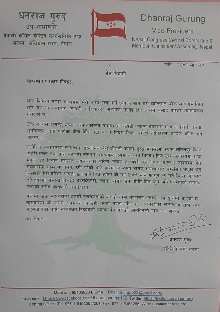 काठमाडौं । नेपाली कांग्रेसका उपसभापति धनराज गुरुङले आफूले सहकारीको रकम अपचलन नगरेको बताएका छन् ।