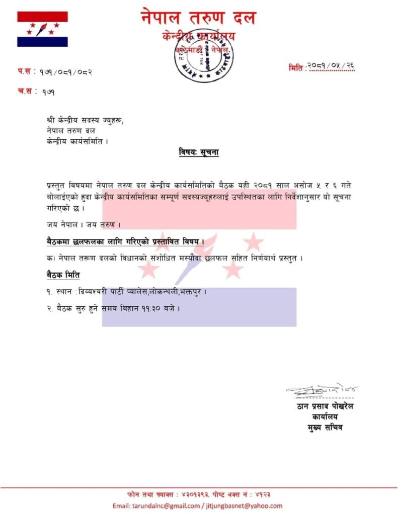 तरुण दल अध्यक्ष गुरुङद्वारा केन्द्रीय कार्यसमितिको बैठक आह्वान