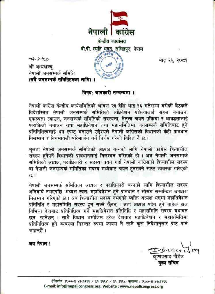 ‘नेपाली जनसम्पर्क समितिको अध्यक्ष बन्नको लागि नेपाली कांग्रेसको क्रियाशील सदस्य हुनैपर्ने विधानको प्रावधानलाई निलम्बन गरिएको हो’, परिपत्रमा भनिएको छ, ‘अब नेपाली जनसम्पर्क समितिको अध्यक्ष, पदाधिकारी र सदस्य चयन गर्दा नेपाली कांग्रेसको क्रियाशील सदस्य वा नेपाली जनसम्पर्क समितिका सदस्यमध्येबाट चयन हुन सक्ने स्पष्ट व्यवस्था गरिएको छ ।’