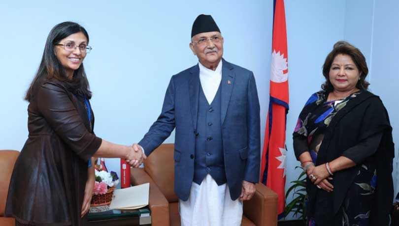न्यूयोर्क । प्रधानमन्त्री केपी ओली र अमेरिकी इन्टरनेसनल डेभलपमेन्ट फाइनान्स कोअपरेसनकी उप–प्रमुख कार्यकारी अधिकृत निशा विश्वालबीच भेटवार्ता भएको छ ।