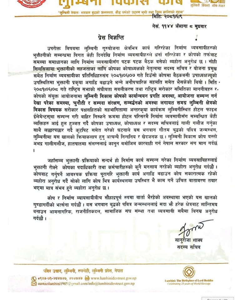 लुम्बिनी गुरुयोजना क्षेत्रभित्र कार्य गरिरहेका निर्माण व्यवसायीहरूको भुक्तानीको सम्बन्धमा केही दिनदेखि निर्माण व्यवसायीहरूले धर्ना गरिरहेकाकोमा कोषको तर्फबाट समस्या समाधानका लागि निर्माण व्यवसायीसँग पटकपटक बैठक बसेको समेत विज्ञप्तिमा भनिएको छ ।