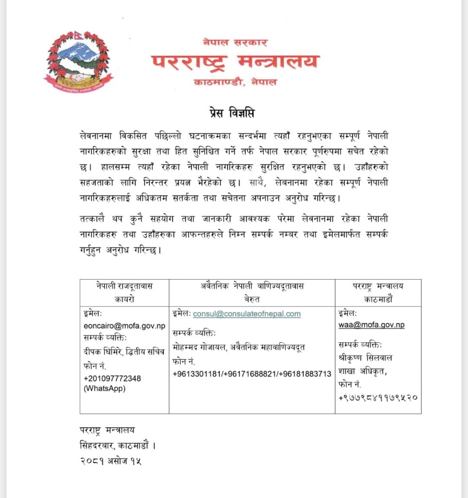 परराष्ट्रमन्त्री डा.आरजु राणा देउवाको विशेष चासो र चिन्तापछि मन्त्रालयले मंगलबार विज्ञप्ति जारी गरेर लेबनानमा रहेका सम्पूर्ण नेपाली नागरिकहरूलाई अधिकतम सतर्कता तथा सचेतना अपनाउन अनुरोध गरेको छ ।