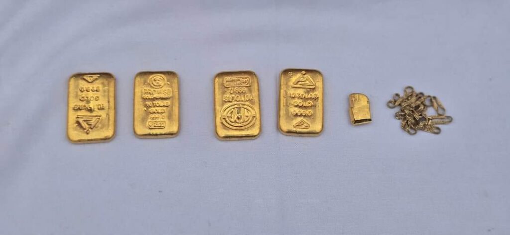 बिल बिजक नभएको अबैध भन्सार छलि ल्याइएको सुन जस्तो देखिने पहेलो धातुको बिस्कुटको आकारको टुक्रा ४ थान, बिस्कुटको सानो टुक्रा १ थान, सिक्री १ थान गरी जम्मा ४९० ग्राम ८८० मिलिग्राम बरामद भएको छ ।