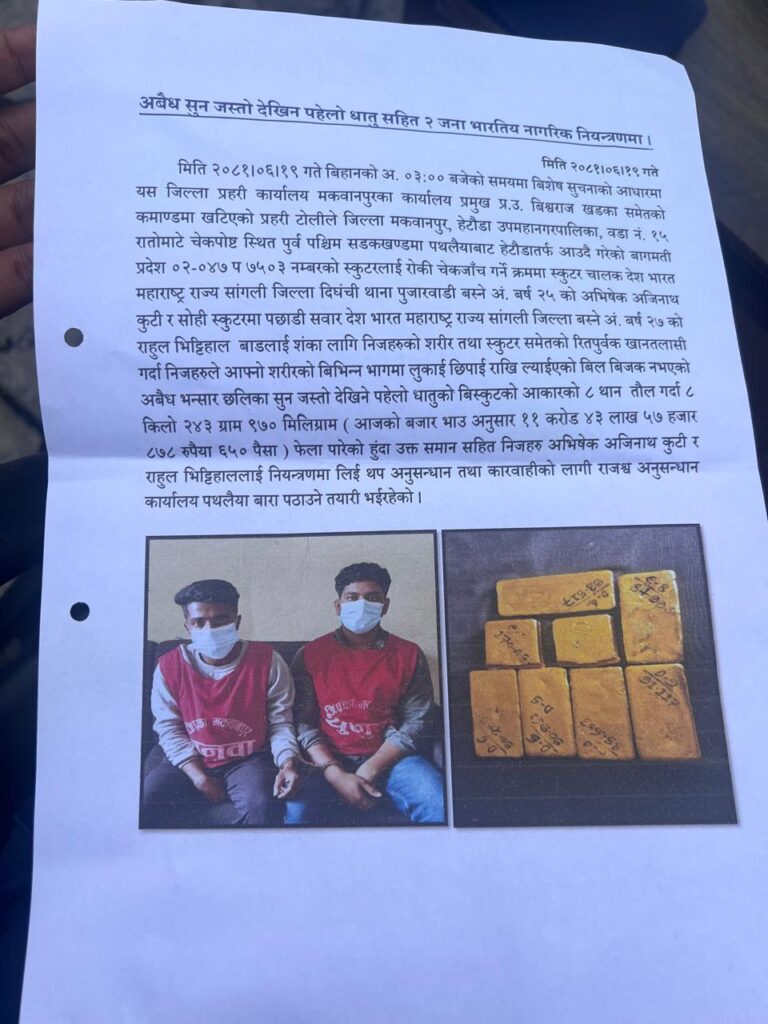 शनिबार मकवानपुर प्रहरी प्रमुख (एसपी) विश्वराज खड्काले पत्रकार सम्मेलन गरेर भारतीय नागरिक दुई जनालाई भन्सार छलि गरेर ल्याएको ८ किलो सुनसहित पक्राउ गरिएको बताएका छन् । बरामद भएको सुनको हालको मूल्य ११ करोड ४३ लाख ५७ हजार ८ सय ७८ रुपियाँ र ६ सय ५० पैसा रहेको छ ।