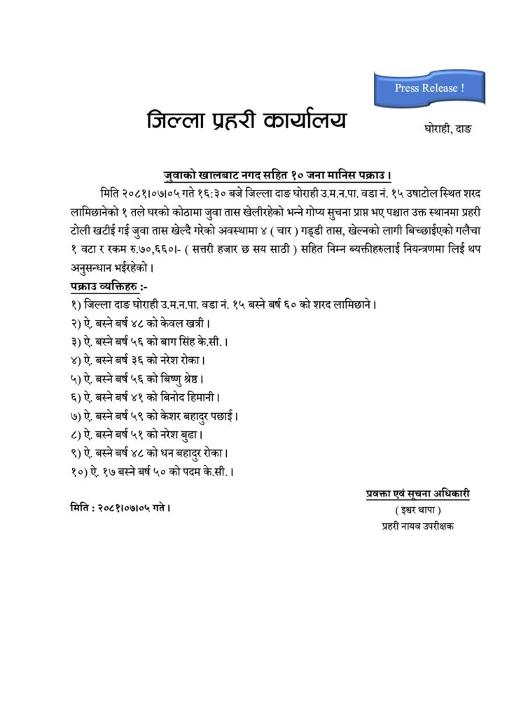 घोराही । जिल्ला प्रहरी कार्यालय दाङले जुवाको खालबाट नगदसहित १० जना मानिसहरूलाई पक्राउ गरेको छ ।