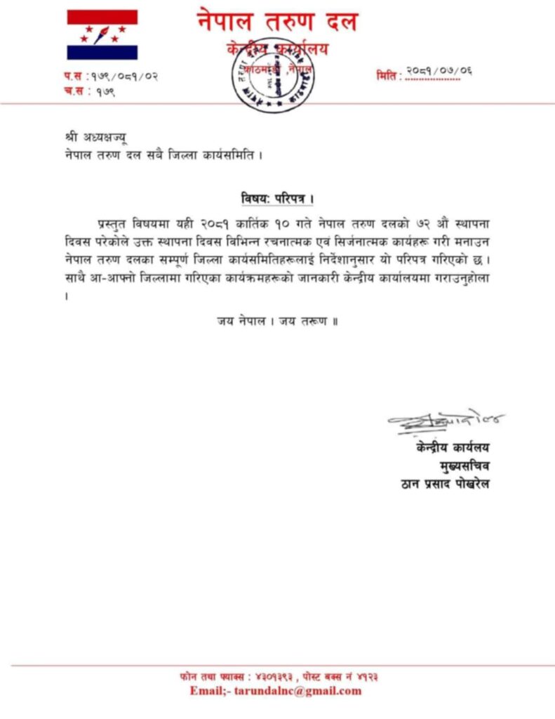 तरुण दलको स्थापना दिवस कात्तिक १० गते परेको छ । परिपत्रमा भनिएको छ, ‘२०८१ कात्तिक १० गते नेपाल तरुण दलको ७२औँ स्थापना दिवस परेकोले उक्त स्थापना दिवस विभिन्न रचनात्मक एवम् सिर्जनात्मक कार्यक्रमहरू गरी मनाउन नेपाल तरुण दलका सम्पूर्ण जिल्ला कार्यसमितिहरूलाई निर्देशनसहित परिपत्र गरिएको छ ।’