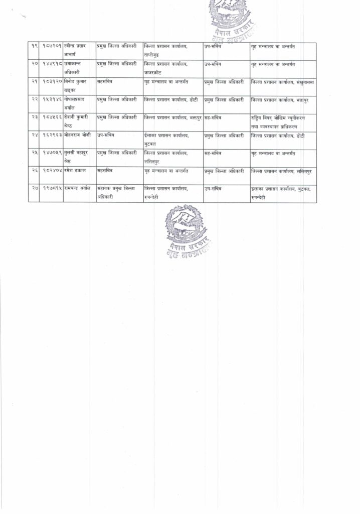 शुक्रबार गृह मन्त्रालयले २७ जना कर्मचारीहरूको पदस्थापन तथा सरूवा गर्ने निर्णय गरेको छ । १९ वटा जिल्ला प्रशासन कार्यालय र एउटा इलाका प्रशासन कार्यालय प्रमुखको हेरफेर भएको छ ।
