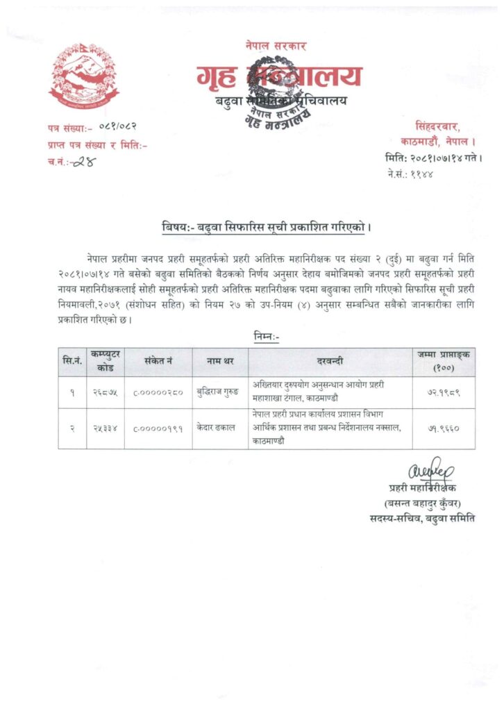 काठमाडौं । नेपाल प्रहरीका दुई जना प्रहरी नायव महानिरीक्षक डीआईजी बुद्धिराज गुरुङ र केदार ढकाल प्रहरी अतिरिक्त महानिरीक्षक एआईजी बढुवा सिफारिस भएका छन् ।