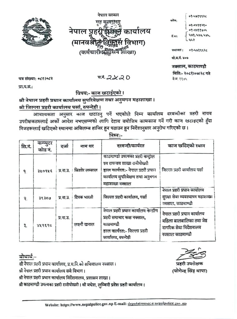 प्रहरी प्रधान कार्यालय केन्द्रीय प्रहरी समाचार कक्ष नक्सालमा दरबन्दी भइ जिल्ला प्रहरी कार्यालय रुपन्देहीमा कार्यरत डीएसी लक्ष्मी खनाललाई पनि हेडक्वाटर तानिएको छ ।