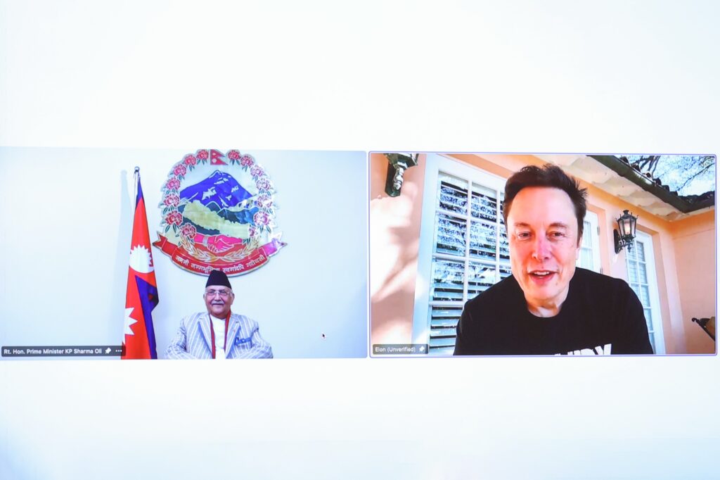 प्रधानमन्त्री ओलीको निजी सचिवालयले ओली र मस्कबीच भिडियो सम्वाद भइरहेको तस्बिर सार्वजनिक गरेको छ ।