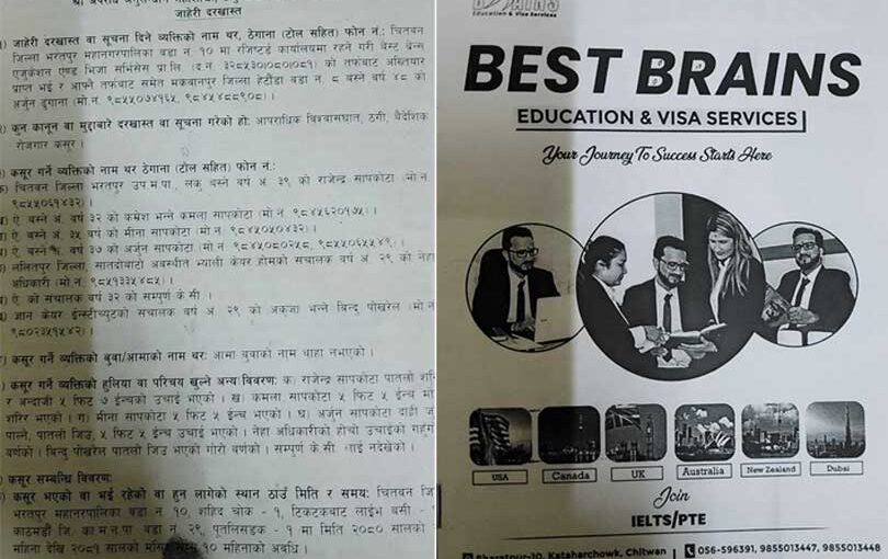 काठमाडौं । बेस्ट ब्रेन्स एजुकेशन एण्ड भिजा सर्भिसेज प्रा.लि.का विषयमा विभिन्न व्यक्तिले अबैध उठ्तीपुठ्ती गरेर ठगी गरेपछि वैदेशिक रोजगारी विभाग र नेपाल प्रहरीका विभिन्न निकायमा जाहेरी पर्न लागेका छन् ।