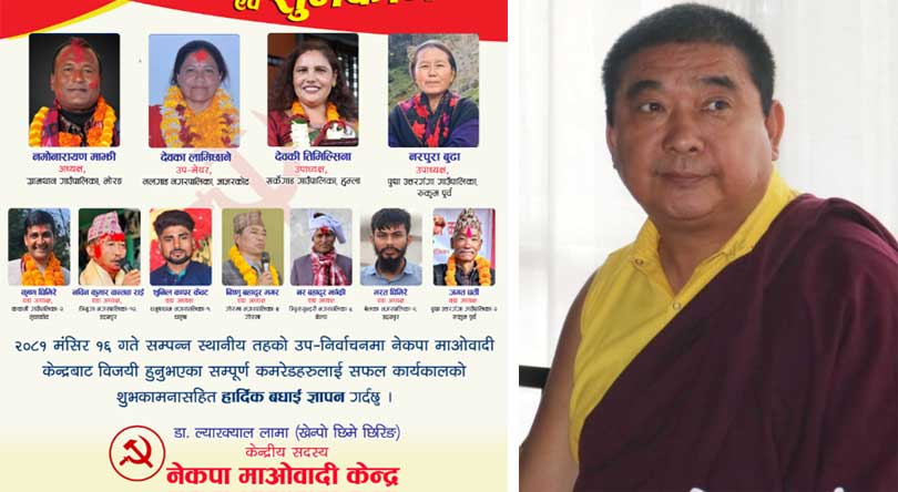 काठमाडौं । नेकपा (माओवादी केन्द्र)का केन्द्रीय सदस्य डा.ल्यारक्याल लामा (खेन्पो छिमे छिरिङ)ले स्थानीय तहको उपनिर्वाचनमा विजयी भएका माओवादीका उम्मेदवारहरूलाई बधाइ दिएका छन् ।