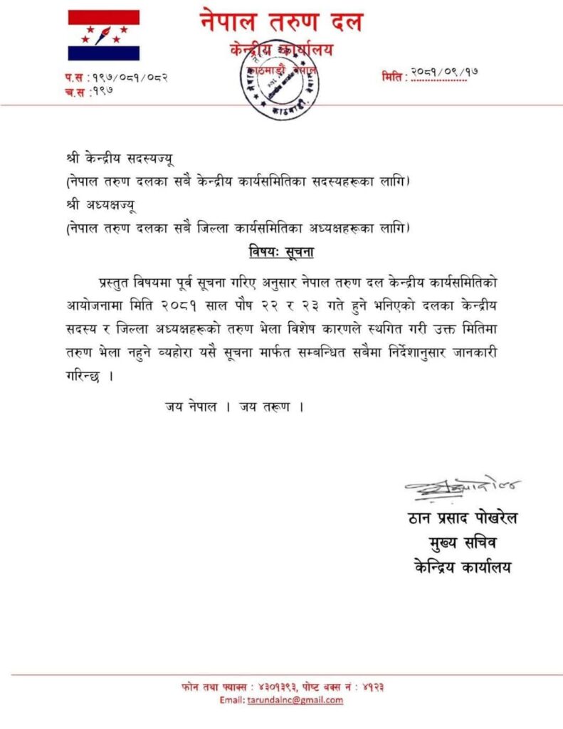 तरुण दलको केन्द्रीय कार्यालयका मुख्य सचिव ठानप्रसाद पोखरेलले बुधबार सूचना प्रकाशित गरेर पौष २२ र २३ गते ललितपुरस्थित नेपाली कांग्रेसको केन्द्रीय कार्यालयमा हुने भनिएको तरुण भेला विशेष कारणले स्थगित भएको जनाएका छन् ।