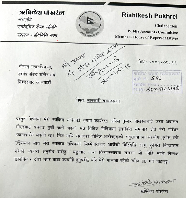 काठमाडौं । सार्वजनिक लेखा समितिका सभापति ऋषिकेश पोखरेलले अनिलकुमार पोखरेललाई स्वकीय सचिव पदबाट हटाएका छन् ।