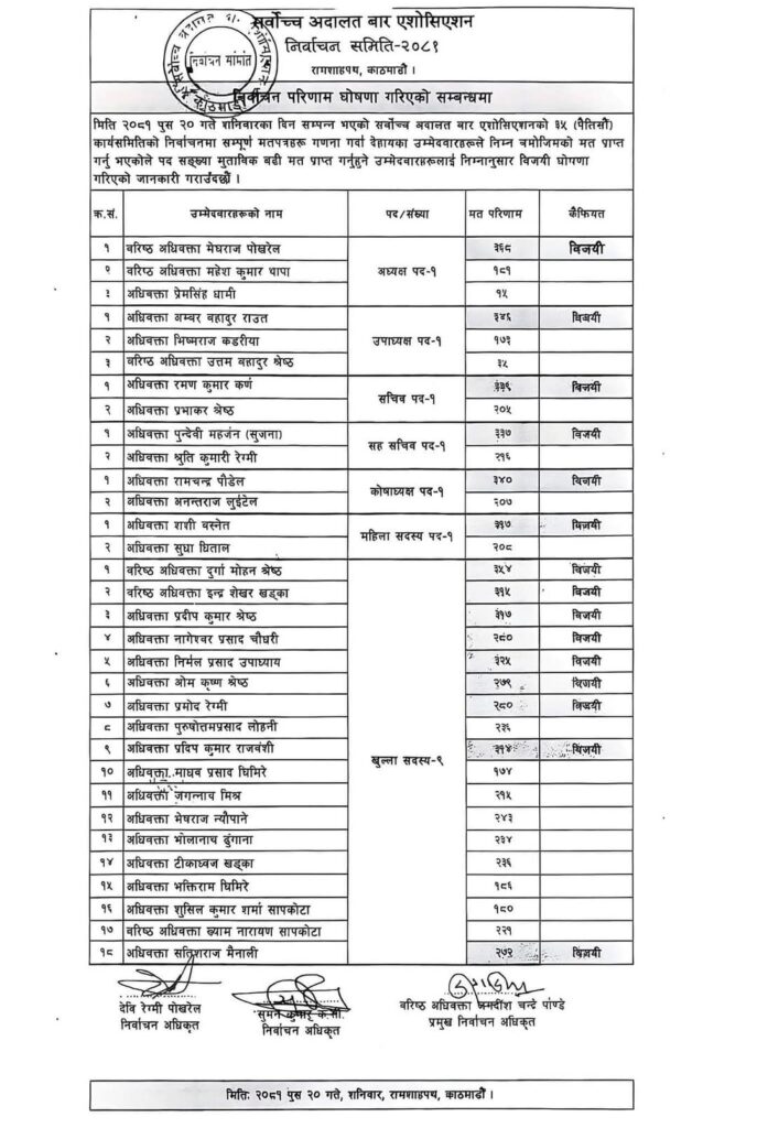 शनिबार काठमाडौंको रामशहापथस्थित सर्वोच्च अदालत परिसरमा भएको निर्वाचनमा कांग्रेस निकटको डीएलएका उम्मेदवार वरिष्ठ अधिवक्ता मेघराज पोखरेल अध्यक्षमा विजयी भएका छन् । पोखरेल ३६८ मतसहित विजयी भएको निर्वाचन समितिले जनाएको छ ।