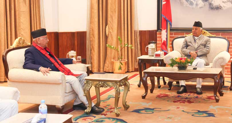 शुक्रबार राष्ट्रपति भवन शीतल निवासमा राष्ट्रपति पौडेलसँग प्रधानमन्त्री ओलीले भेट गरेका हुन् । भेटमा के विषयमा कुराकानी भएको हो केही भनिएको छैन । उनीहरूका बीच मुलुकको समसामयिक विषयमा छलफल भएको प्रधानमन्त्री ओलीको निजी सचिवालयले जनाएको छ ।