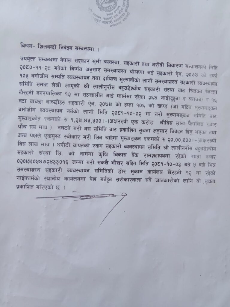 काठमाडौं । समस्याग्रस्त सहकारी व्यवस्थापन समितिले श्री लालीगुराँस बहुउद्देश्यीय सहकारी संस्थाको गाई फार्ममा अदालतको आदेशलाई बेवास्ता गर्दै लिलामको कार्यबाही अगाडि बढाएको छ ।