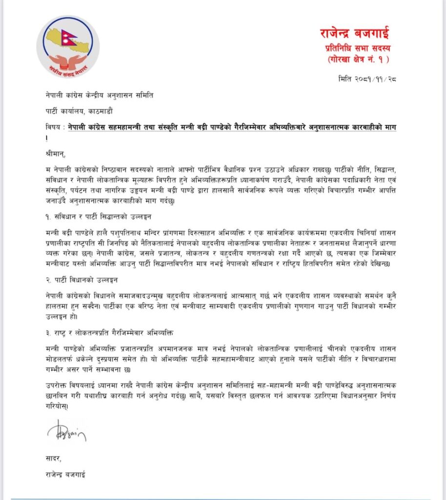 पार्टी नीति र विचारविरुद्ध मन्त्री पाण्डेबाट अभिव्यक्ति आइरहेको हुँदा कारबाही हुनुपर्ने कांग्रेसका सांसद बजगाईंको माग छ ।