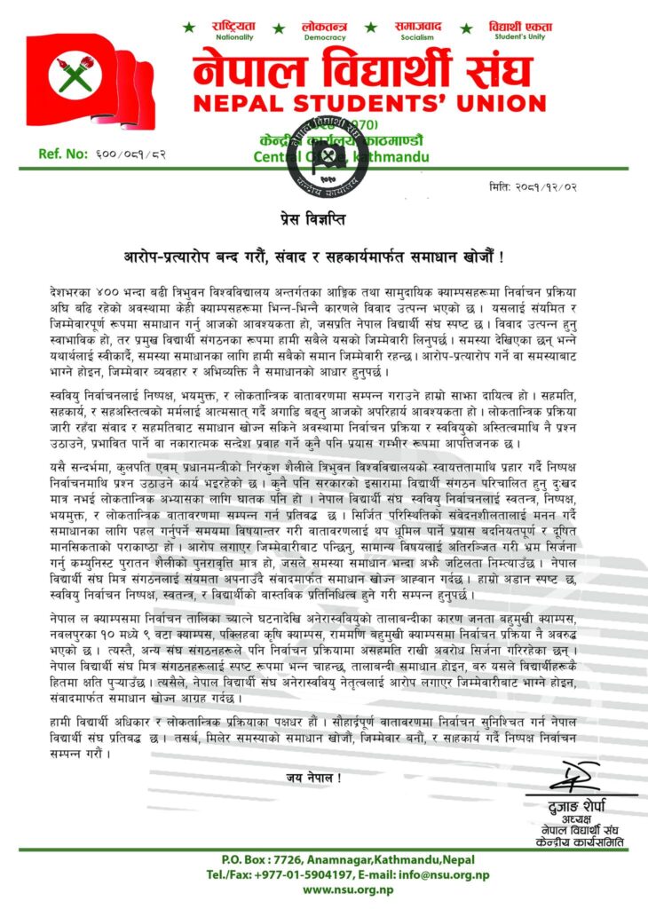 ‘कूलपति एवम् प्रधानमन्त्रीको निरंकुश शैलीले त्रिभुवन विश्वविद्यालयको स्वायत्ततामाथि प्रहार गर्दै निष्पक्ष निर्वाचनमाथि प्रश्न उठाउने कार्य भइरहेको छ’, अध्यक्ष शेर्पाले भने ।