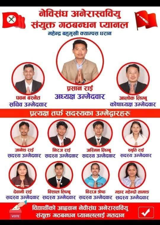 धरान । नेपाल विद्यार्थी संघ (नेविसंघ) र एमाले निकटका अनेरास्ववियुको संयुक्त गठबन्धन प्यानल महेन्द्र बहुमुखी क्याम्पस धरान, सुनरीमा स्वतन्त्र विद्यार्थी युनियन (स्ववियु)को निर्वाचनमा प्रतिस्पर्धामा उत्रिएका छन् ।
