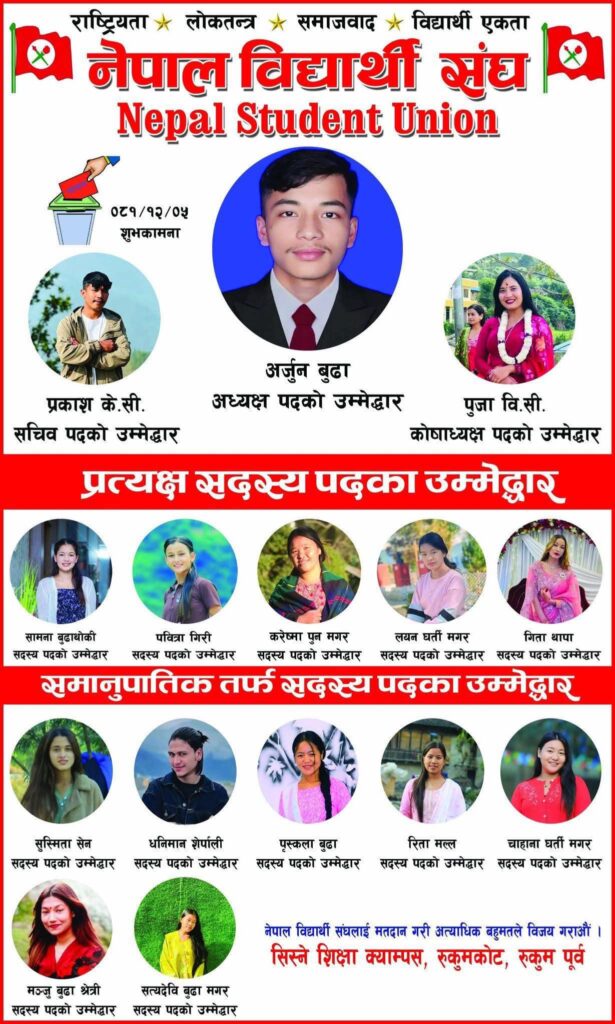 रुकुम पूर्व । नेपाल विद्यार्थी संघ (नेविसंघ)ले स्वतन्त्र विद्यार्थी युनियन (स्ववियु) निर्वाचनका लागि सिस्ने शिक्षा क्याम्पस, रुकुमकोट, रुकुम पूर्वमा सभापतिमा अर्जुन बुढाले मनोनयन दर्ता गराएका छन् ।