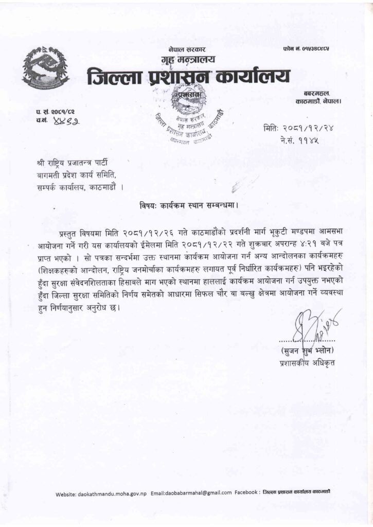 ‘सो पत्रका सन्दर्भमा उक्त स्थानमा कार्यक्रम आयोजना गर्न अन्य आन्दोलनका कार्यक्रमहरू (शिक्षकहरूको आन्दोलन, राष्ट्रिय जनमोर्चाको कार्यक्रमहरू लगायत पूर्वनिर्धारित कार्यक्रमहरू) पनि भइरहेको हुँदा सुरक्षा संवेदनशीलताका हिसाबले माग भएको स्थानमा हाललाई कार्यक्रम आयोजना गर्न उपयुक्त नभएको हुँदा जिल्ला जिल्ला सुरक्षा समितिको निर्णय समेतको आधारमा सिफल चौर वा बल्खु क्षेत्रमा आयोजना गर्ने व्यवस्था हुन निर्णयानुसार अनुरोध छ’, प्रशासकीय अधिकृत भ्लोनले भनेका छन् ।