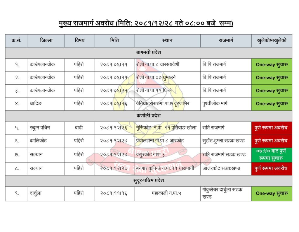 बिहीबार बिहान प्रहरीद्वारा जारी विज्ञप्तिअनुसार देशभरिका ९ स्थानमा सडकहरूमा पहिरो खसेर अवरोध भएका छन् । केही स्थानमा आवागम सुचारु भइसकेका छन् भने केही स्थानमा एकतर्फ सडक खुलेका छन् ।