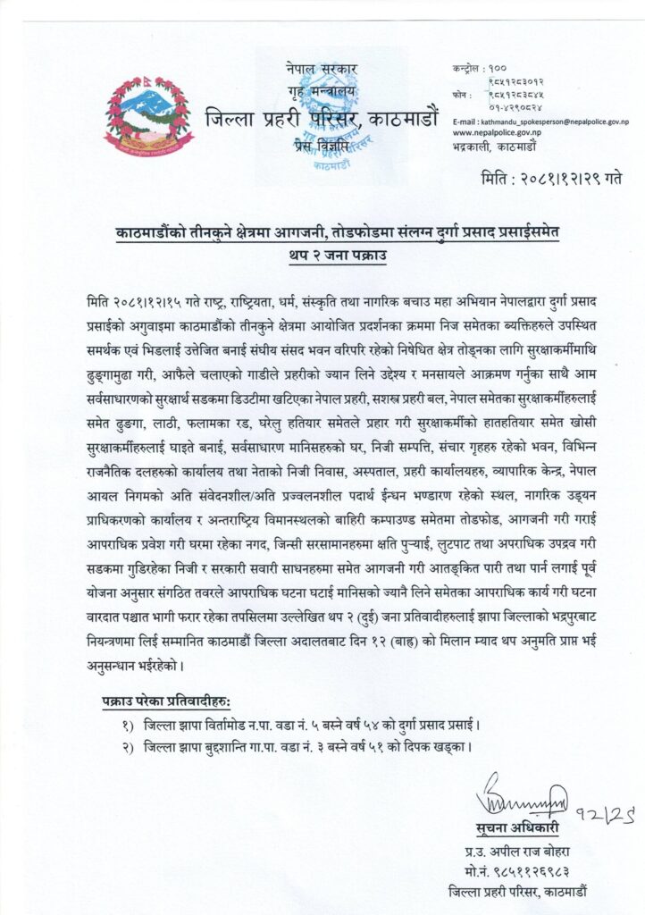 विज्ञप्तिमा भनिएको छ, ‘सडकमा गुडीरहेका निजी र सरकारी सवारी साधनहरू समेत आगजनी गरी आतंकित पारी तथा पार्न लगाई पूर्व योजनाअनुसार संगठित तवरले आपराधिक घटना घटाई मानिसको ज्यानैलिने समेतका आपराधिक कार्य गरी घटना वारदात पश्चात भागी फरार रहेका तपसिलका उल्लेखत थप २ जना प्रतिवादीहरूलाई झापा जिल्लाको भद्रपुरबाट नियन्त्रणमा लिई काठमाडौं जिल्ला अदालतबाट दिन १२ मिलान म्याद थप अनुमति प्राप्त भई अनुसन्धान भइरहेको छ ।’