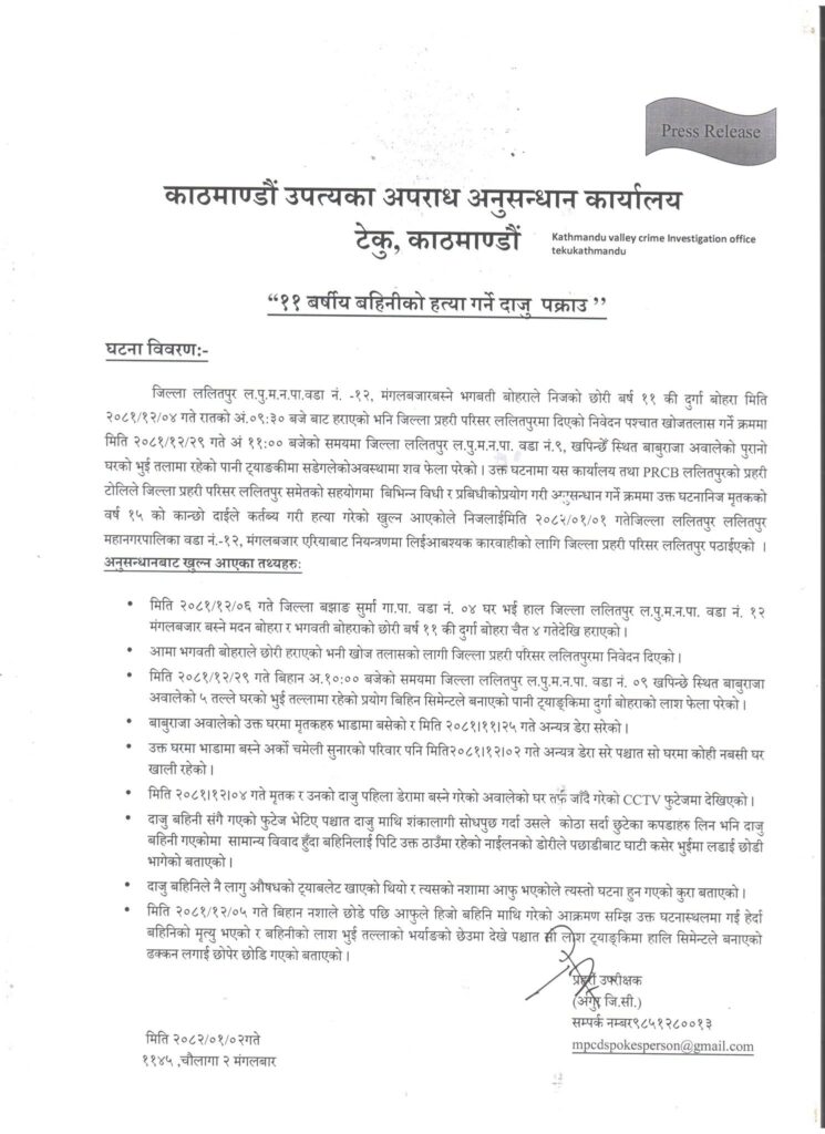 काठमाडौं । आफ्नै दाइले बहिनी ११ वर्षीया दुर्गा बोहराको हत्या गरेको खुलेको प्रहरीले जनाएको छ ।