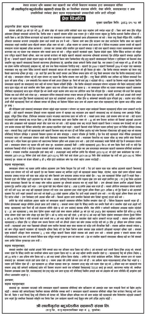 मंगलबार प्रेस विज्ञप्ति जारी गरेर लालीगुराँसले संस्थाका केही कर्मचारीहरूबाट निलम्बित संचालक समितिसँग समन्वय नगरी र समस्याग्रस्त सहकारी व्यवस्थापन समितिको स्वीकृत विना कारोवार मिलाउछु भनी जग्गा बैना गर्ने, निक्षेप र कर्जा मिलाई दिन्छु भनेर गैह्र कानूनी गतिविधि गरिरहेको जनाएको छ ।