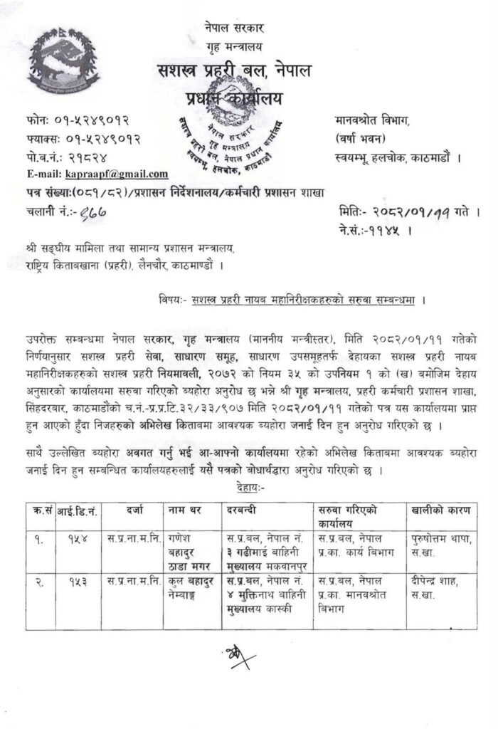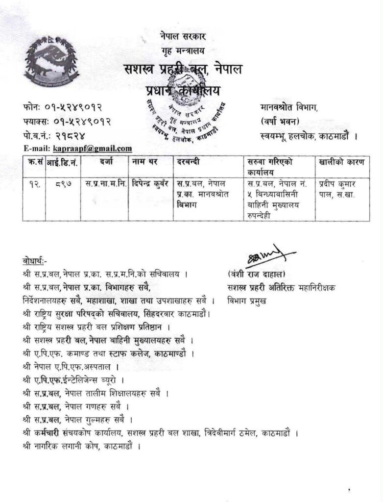 गढिमाई बाहिनीबाट डीआईजी गणेश ठाडा मगरलाई कार्यविभागमा सरुवा गरिएको छ । मुक्तिनाथ बाहिनीबाट डीआईजी कुलबहादुर नेम्वाङलाई मानवस्रोत विभागमा सरुवा गरिएको छ ।