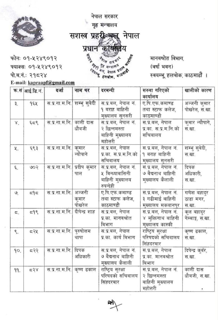 बिहीबार गृह मन्त्रालयले ६ प्रदेशका प्रमुखसहित विभिन्न जिम्मेवारीमा रहेका डीआईजीहरूको सरुवा गरेको सूचनामा उल्लेख छ । सशस्त्र प्रहरी बलका प्रवक्ता रहेका डीआईजी कुमार न्यौपानेलाई कोशी प्रदेशअन्तर्गतको बराह बाहिनीमा सरुवा गरिएको छ । बराह बाहिनीको जिम्मेवारी सम्हालेका डीआईजी शम्भु सुवेदीलाई स्टाफ कलेजमा सरुवा गरिएको छ ।