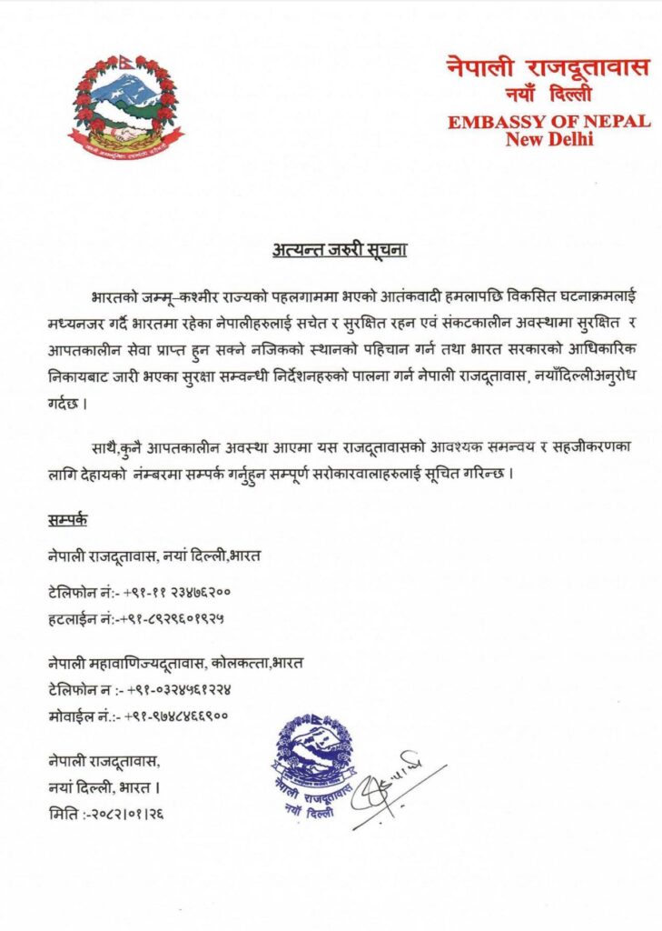 भारतको जम्मू–कश्मीर राज्यको पहलगाममा भएको आतंकवादी हमलापछि विकसित घटनाक्रमलाई मध्यनजर गर्दै भारतमा रहेका नेपालीहरूलाई सचेत र सुरक्षित रहन एवम् संकटकालीन अवस्थामा सुरक्षित र आपतकालीन सेवा प्राप्त हुन सक्ने नजिकको स्थानको पहिचान गर्न तथा भारत सरकारको आधिकारिक निकायबाट जारी भएका सुरक्षा सम्बन्धी निर्देशनहरूको पालना गर्न नेपाली राजदूतावास, नयाँ दिल्ली अनुरोध गर्दछ’, सूचनामा भनिएको छ ।
