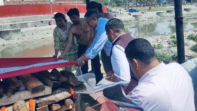 शनिबार पशुपति आर्यघाटमा पुगेर नेता खाणले शर्माप्रति श्रद्धाञ्जलि व्यक्त गर्दै नेपाली कांग्रेसको झण्डा ओढाएर सम्मान गरेका छन् ।