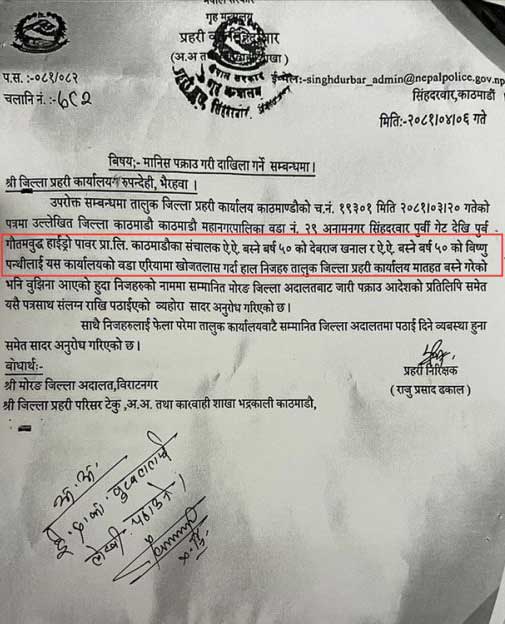 जिल्ला अदालत मोरङबाट जारी भएको पक्राउ पूर्जी जिल्ला प्रहरी परिसर काठमाडौं, अपराध अनुसन्धान तथा कारबाही शाखा, जिल्ला प्रहरी कार्यालय रुपन्देहीसहित मातहतका सबै प्रहरी युनिटमा पुगेको छ ।