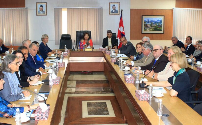 काठमाडौं । परराष्ट्रमन्त्री डा.आरजु राणासँग नेपालका लागि युरोपियन युनियन आबद्ध देशका राजदूतहरूले संयुक्त रुपमा भेट गरेका छन् ।