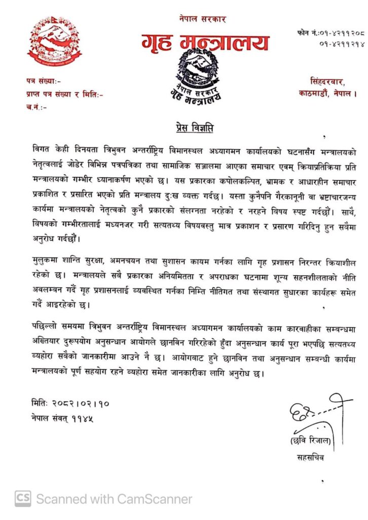 विमानस्थल अध्यागमनको घटनाका विषयमा विभिन्न घटनाहरूसँग गृह मन्त्रालय र गृहमन्त्री रमेश लेखकलाई जोडेर समाचार तथा टिकाटिप्पणी आएपछि विज्ञप्ति जारी गरेर गृह मन्त्रालयले आक्षेपहरूको खण्डन गरेको छ ।
